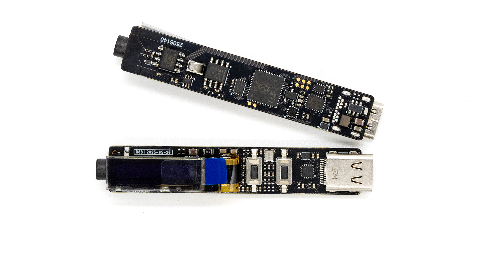 The result is a compact 59 by 11 mm, four-layer board, with components on both sides, often less than a millimeter away from the edge, most passives in 0402, a large number of vias, and even vias in pads. And the most absurd part? Because the design is cylindrical, the PCB has to be partially pocketed (also called z-axis milling) so that the 3.5 mm jack sits at the same height as the USB Type-C connector.